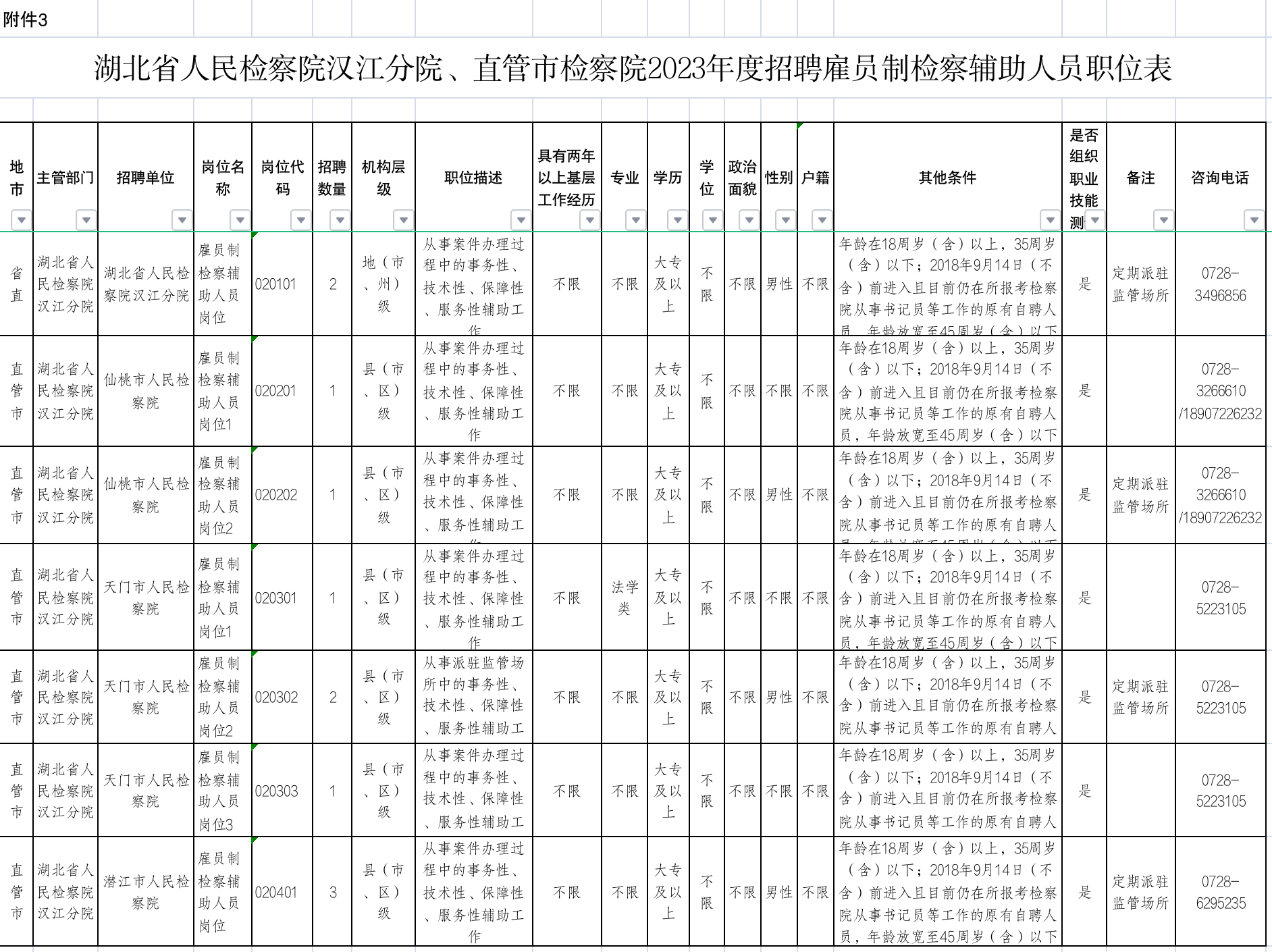 考生可登陆湖北省人事考试网(www.hbsrsksy.cn)、湖北省人民检察院汉江分院凯发棋牌官网(hj.hbjc.gov.cn)或微信公众号(汉江检察、仙桃检察、潜江检察、天门检察)查询具体招聘人数和职位资格条件,详见《汉江检察机关2023年度雇员制检察辅助人员职位表》。