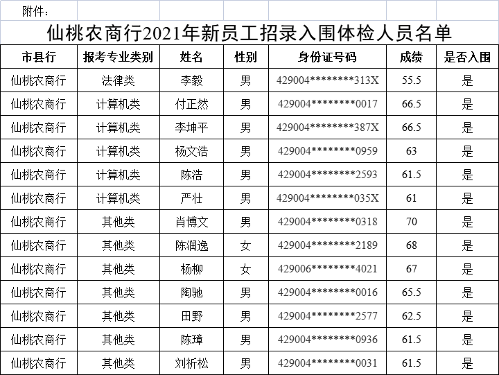 根据“全省农商行2021年新员工招录公告”的有关规定,按照划定入围分数线的规则,现已划定入围分数线,确定了入围体检环节人员名单,现将结果公告如下: