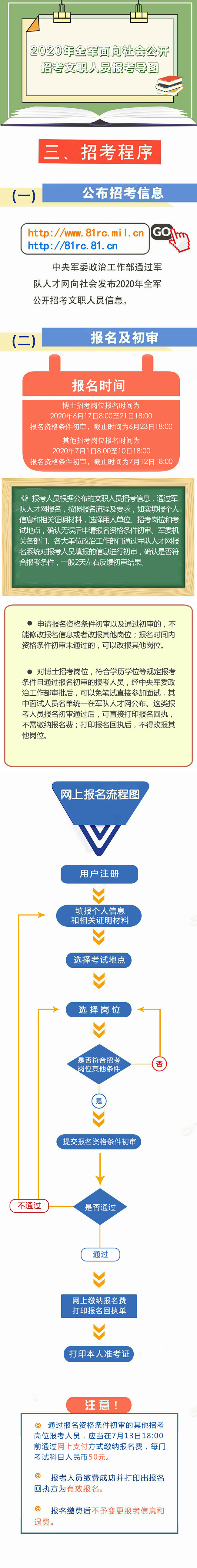 2020年全军面向社会公开招考文职人员报名入口已经开通,博士招考岗位报名时间为2020年6月17日8:00至21日18:00;报名资格条件初审,截止时间为6月23日18:00。其他招考岗位报名时间为2020年7月1日8:00至10日18:00;报名资格条件初审,截止时间为7月12日18:00。考生请抓紧时间进行报名。