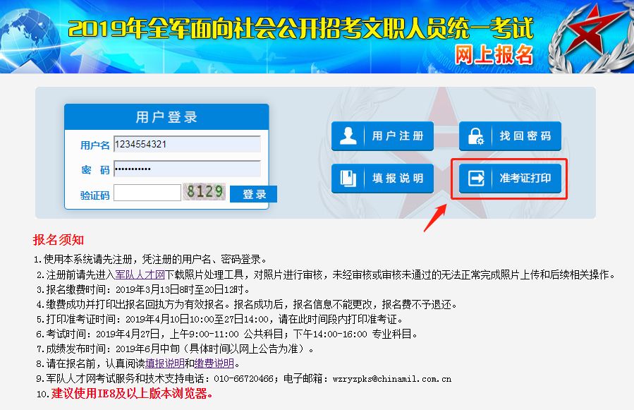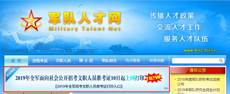 考生于8月12日起用ie浏览器登陆军队人才网,点击下图示”准考证打印入口“进入下一界面。