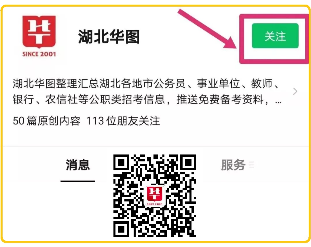 ①扫描下方二维码,关注湖北华图微信公众号,后台回复“省考”查看更多湖北公务员内容和资料;